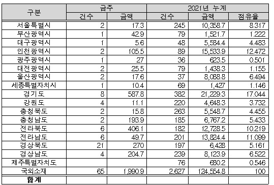 지역별로는 경기도 588억 원, 전라북도 406억 원, 경상북도 270억 원, 그 밖의 지역이 729억 원이다.