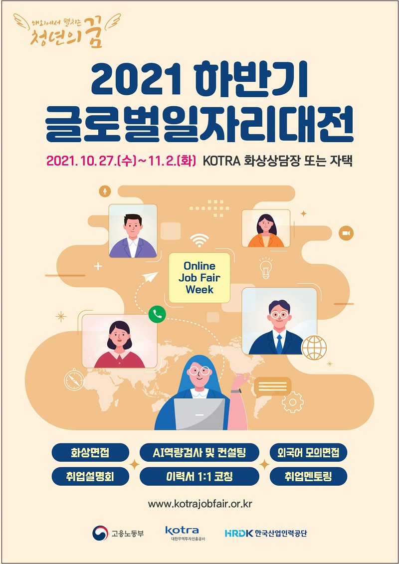 고용노동부(장관 안경덕)와 대한무역투자진흥공사(사장 유정열), 한국산업인력공단(이사장 어수봉)은 10월 27일부터 11월 2일까지 7일간 "2021 하반기 글로벌 일자리 대전"을 개최한다.