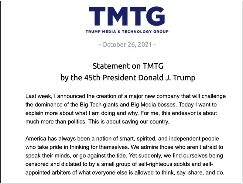 새 플랫폼은 미국처럼 자유롭고, 활기가 넘치고, 생동적이고, 다양할 것입니다. 트루스 소셜(Truth Social)은 우리 계획의 시발점에 불과합니다. 트럼프 미디어 기술 그룹은 빅테크와 빅미디어 큰손들이 만든, “woke”에다 정치색이 짙은 엔터테인먼트 프로그램들과 겨룰 온디맨드 영상 스트리밍 서비스도 런칭할 계획입니다. TMTG는 또한 웹 서비스나 지불 서비스 등 주요 영역에서 “cancel-proof(캔슬 방지)” 대안을 만들 수 있는 기회를 모색할 것입니다.