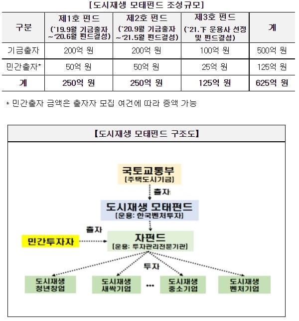 도시재생 모태펀드는 공공과 민간이 공동출자하는 구조로 주택도시기금(도시계정)과 민간출자금을 합하여 ‘19년부터 ’21년까지 3년간 총 625억 원 규모로 조성을 추진하고 있으며, 제1호와 제2호 도시재생 모태펀드는 모두 250억 원 규모로 조성되어 올해부터 본격적인 기업 발굴·투자 중에 있다.