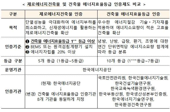 또한, ZEB 인증시 에너지소비량은 건축물 에너지효율등급 인증을 통해 평가하고 있어 사전에 건축물 에너지효율등급 인증을 받아야 하나, ZEB와 건축물 에너지효율등급의 인증기관이 서로 달라 신청 절차가 번거롭다는 지적이 있었다.