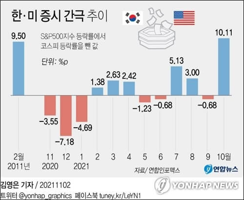 이에 따라 두 나라의 대표 지수 간 차이(S&P500지수 등락률에서 코스피 등락률을 뺀 값)는 10.11%포인트를 기록했다.