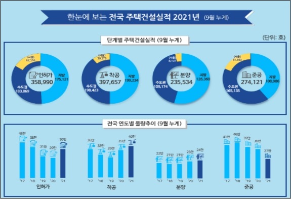 (종합) 9월 누계 주택 착공실적은 전국 397,657호로 전년 동기 대비(351,737호) 13.1% 증가하였다.