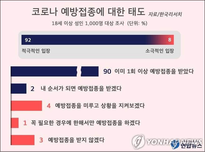 한국리서치가 10월 둘째 주에 발표한 만 18살 이상 성인 1천명 대상 설문조사 결과를 보면 예방접종을 미루고 상황을 지켜보겠다는 응답 4%, 출국 등 꼭 필요한 경우에 한해서만 예방접종을 받겠다는 응답 1%, 예방접종을 받지 않겠다는 응답 3%로, 총 8%가 예방접종에 소극적인 입장을 보였다.