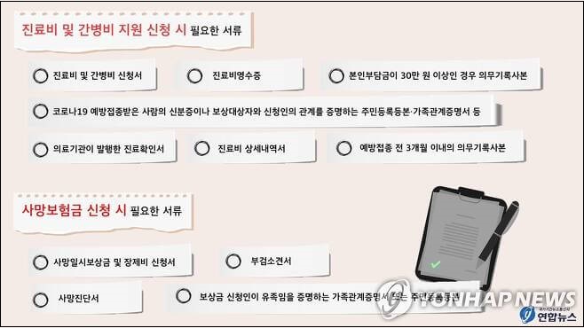 진료비와 간병비를 지원받으려면 ▲진료비 및 간병비 신청서 ▲코로나19 예방접종받은 사람의 신분증이나 보상대상자와 신청인의 관계를 증명하는 주민등록등본·가족관계증명서 등 ▲의료기관이 발행한 진료확인서 ▲진료비영수증 ▲진료비 상세내역서 ▲본인부담금이 30만 원 이상인 경우 의무기록사본 ▲예방접종 전 3개월 이내의 의무기록사본을 구비해야 한다.