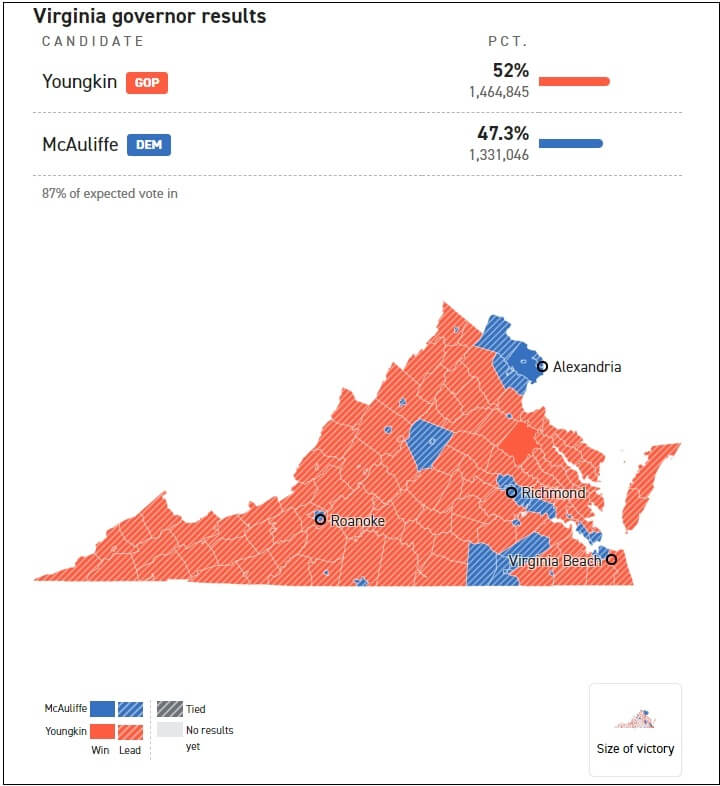 예상 투표수의 약 4분의 3이 개표된 가운데, 영킨은 9점 차로 앞섰는데, 이것은 더 많은 투표가 개표됨에 따라 상당히 좁혀질 것으로 예상되지만, 이는 조 바이든 대통령이 버지니아를 10점 차로 이긴 지 1년 만에 영킨과 그의 당이 얻은 주요 이득을 반영한다.