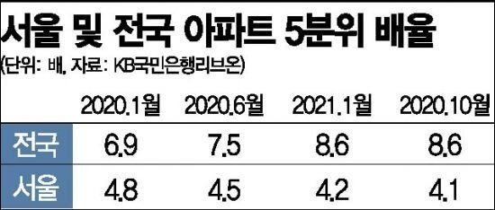 5분위 배율은 주택을 가격순으로 5등분해 상위 20%(5분위) 평균 가격을 하위 20%(1분위) 평균 가격으로 나눈 값이다.