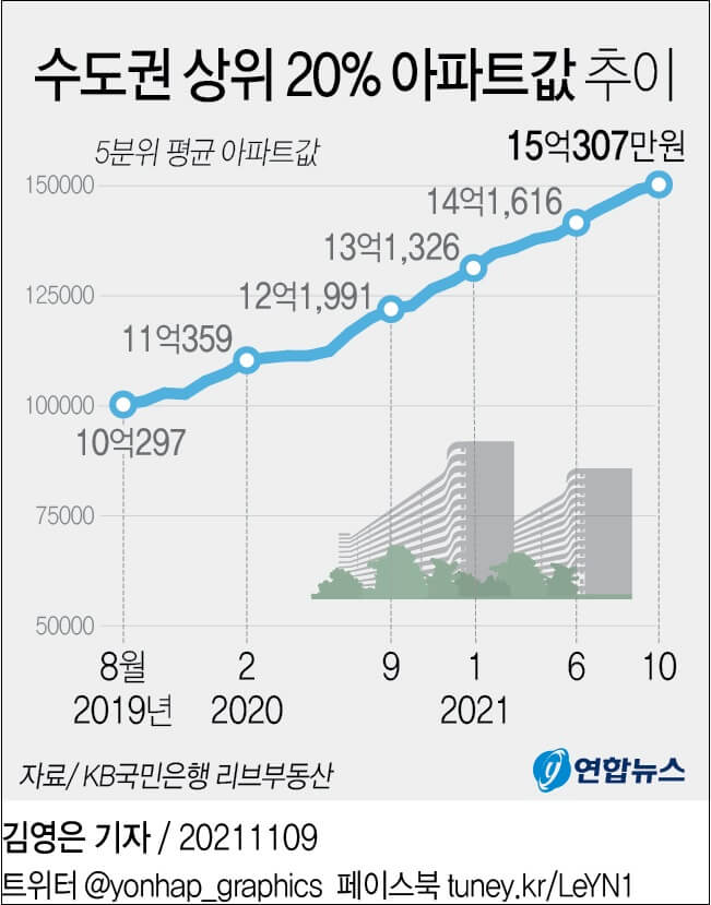 수도권 5분위 아파트값은 2019년 8월(10억297만원)에 평균 10억원을 넘은 뒤 작년 2월(11억359만원) 11억원을 돌파하며 반년 만에 1억원 넘게 올랐다. 그 후 7개월 만인 작년 9월(12억1천991만원) 12억원을 돌파했고, 이로부터 불과 4개월 만인 올해 1월(13억1천326만원)에 13억원도 넘어섰다.