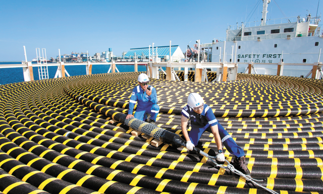공장에서 만든 수십㎞짜리 케이블을 끊어지지 않도록 선박에 싣는 것부터 쉽지 않다. 원형의 '턴테이블'을 공장과 선박에 설치한 후 1분에 5~10m 속도로 팽이 줄을 감듯 케이블을 배로 이동시킨다. 이후 해저케이블을 배에 싣고 매설 지점으로 이동해 수중로봇이 바다 밑에 케이블을 매설한다.