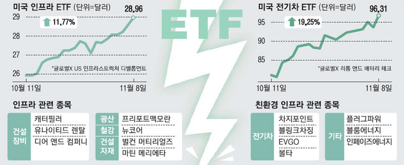 각 부문 대표 기업 주가를 아우르는 상장지수펀드(ETF) 실적으로 보면, 전기차 관련주 ETF인 '글로벌 X 리튬 앤드 배터리 테크'가 지난달 11일~이달 8일 한 달 새 19.25% 올라 기존 인프라 기업 ETF인 '글로벌 X US 인프라스트럭처 디벨롭먼트'(11.77%) 상승세를 넘어선 상태다.