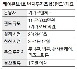 9일 정보기술(IT) 업계와 투자은행(IB) 업계에 따르면 카카오와 자회사 카카오벤처스는 다음달까지 케이큐브1호 벤처펀드 최종 청산과 수익 분배를 완료할 예정이다.