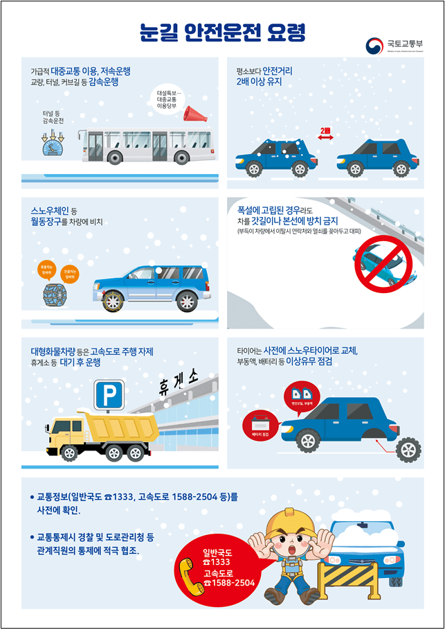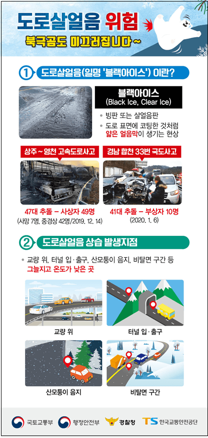 국토교통부 이윤상 도로국장은 “정부는 겨울철 도로사고 예방을 위해 사전 대비에 만전을 기하고, 폭설이나 살얼음이 발생되는 경우에는 즉시 국민께 상황을 알리고 신속히 위험요소를 제거하는데 노력을 집중할 것”이라며, 가장 효과적인 안전대책은 안전운전이므로 도로 이용자 분들께는 「도로 살얼음 위험 및 교통사고 예방수칙」과 「눈길 안전운전요령」을 숙지·준수하여 주시고, 눈길에서는 가급적 대중교통을 이용해 주시길 부탁드린다.”고 말했다.