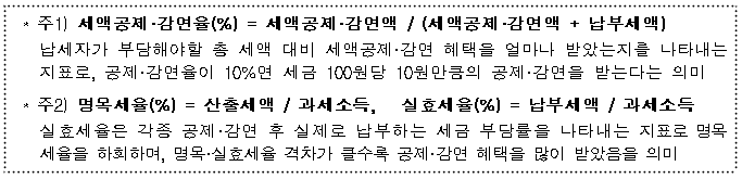 * 주3) 외국납부세액공제는 제외 : 외국납부세액공제는 기업이 외국에서 벌어들인 소득에 대해 해당 국가에 납부한 세금을 이중과세 방지를 위해 국내 부담세액에서 차감해주는 제도이기 때문에, 실질적인 공제·감면 혜택에 해당하지 않음