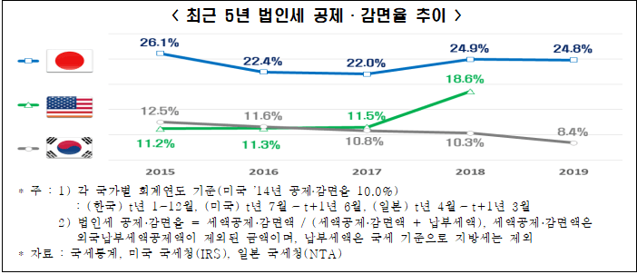 최근 5년간(’15~’19년, 미국은 ’14~’18년) 공제·감면율 추이를 살펴보면, 미국은 공제·감면율이 지속 증가(’14년 10.0%→’18년 18.6%)하였고, 일본은 소폭 등락을 거듭하며 비슷한 수준을 유지(’15년 26.1%→’19년 24.8%)하였다. 반면, 한국은 지난 5년간 공제·감면율이 지속적으로 감소(’15년 12.5%→’19년 8.4%)하면서, 미국‧일본과 대비되는 모습을 보였다.