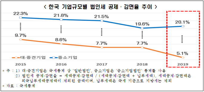국내 기업규모별 공제·감면율, 대·중견기업(5.1%)이 중소기업(20.1%)의 1/4 수준