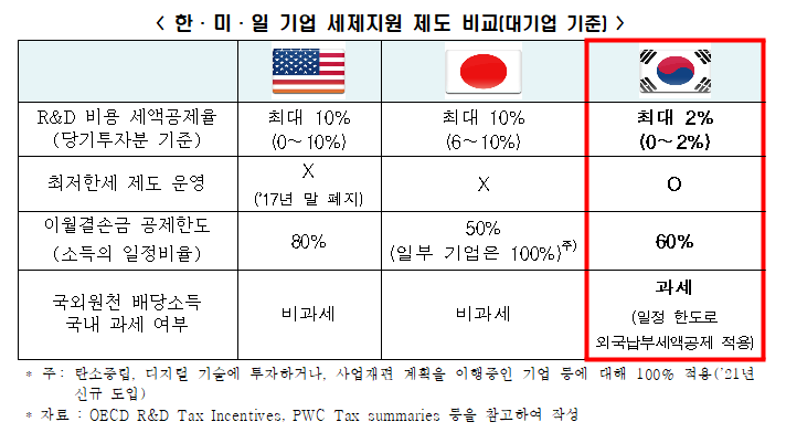한국 기업에 대한 세제지원 수준이 미국·일본 기업의 절반에도 못 미쳐 우리 기업들의 경쟁력 확보에 부정적인 영향을 미칠 수 있다는 주장이 제기되었다.