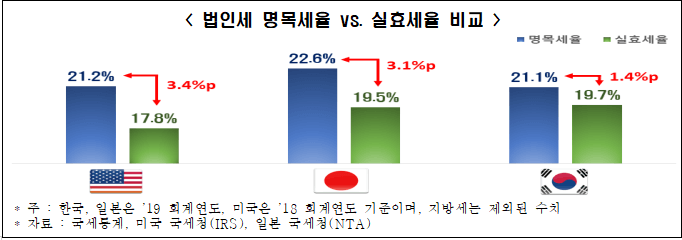 법인세 명목·실효세율 격차 : 미국 3.4%p > 일본 3.1%p > 한국 1.4%p