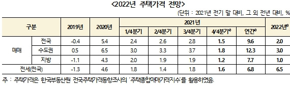 매매가격은 10%에 달하는 올해 상승세보다 둔화될 전망으로, 2022년 수도권 3.0%, 지방 1.0%, 전국 2.0% 상승이 예상된다.