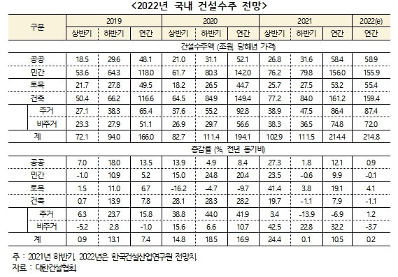 한국건설산업연구원(원장 이재영)은 4일(목) 서울 강남구 건설회관에서 ‘2022년 건설·부동산 경기전망 세미나’를 개최하고 “2022년 국내 건설수주는 전년 대비 0.2% 증가한 214.8조원을 기록하고, 건설투자도 2.4% 회복할 것”으로 전망했다.