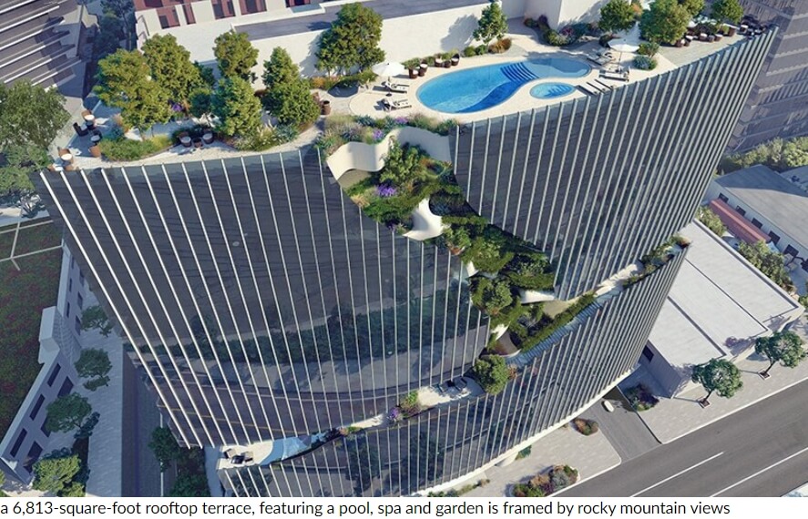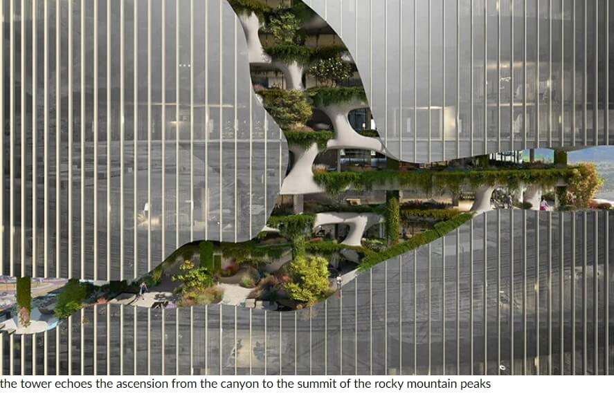 'MAD 건축가들에 의해 자연에서 영감을 받은 디자인은 콜로라도의 전설적인 지형으로부터 영향을 받았고 자연과 건축을 융합하여 균형 잡힌 삶을 영위했다. 그것의 유리 파사드는 마찬가지로 햇빛을 조절하고 그것의 시각적 존재를 부드럽게 하는 루버로 늑골되어 하늘에 고요한 퇴로를 형성한다.