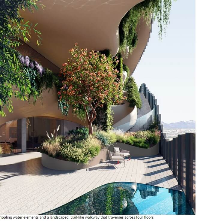 16층짜리 건물에는 187채의 임대주택이 들어설 예정이며, 잔물결치는 물소리와 4층을 가로지르는 풍경화된 산책로 등 13,352평방피트의 야외 편의시설을 갖추고 있으며, 게다가 6,813평방피트의 옥상 테라스를 갖추고 있으며, 멀리 떨어진 바위산 v.즉, 집의 자연적 아름다움과 바로 그 너머의 풍경을 완벽하게 조화시킬 것이다. 북쪽의 한 강은 7,995평방피트의 1층 소매 공간을 포함할 것이다.