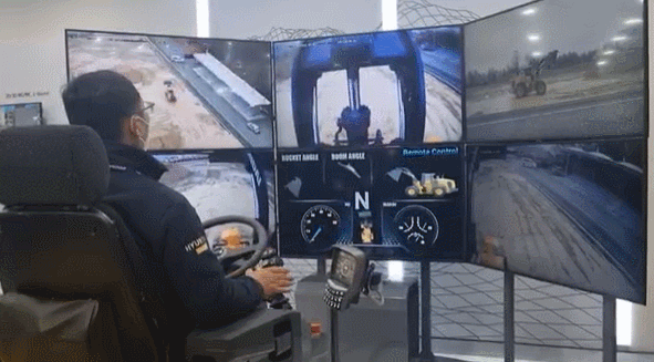 10일 국내 최대 규모의 건설기계전시회인 한국국제건설기계전이 열린 경기 고양시 킨텍스. 현대건설기계 부스에 설치된 콕핏(조종석)에 앉은 임종필 기원이 조종 레버를 이리저리 움직였다. 임 기원의 조종에 따라 화면 속 휠로더(짐 싣는 기계)가 버킷에 흙을 담고 오르막길을 올랐다. 이 휠로더가 있는 곳은 전시장으로부터 약 120㎞ 떨어진 충북 음성군 현대건설기계 공장. 시간 지연이 비교적 적은 5G 통신을 통해 전시장에서 현장에 있는 휠로더를 원격 조종한 것이다.