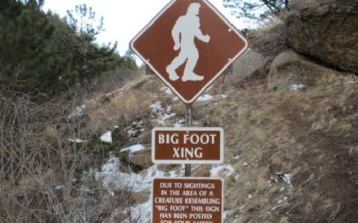 이 경고는 그린 마운틴 폭포의 인근 마을에 사는 한 남자가 빅풋을 보았다고 주장한 후 15년 전 콜로라도 스프링스의 파이크 국립공원 안에 게시되었다. 사진 제공: SpringsGov.com.