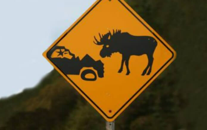 스웨덴, 노르웨이, 핀란드에서도 볼 수 있는 뉴펀들랜드의 이 간판은 아주 명확하다. 하지만 우리는, 비록 무스 충돌이 위험할지라도, 관광객들은 그것을 경고로 받아들이기 보다는 이 간판을 훔칠 가능성이 더 높다고 생각한다. 사진 제공: LonelyPlanet.com.