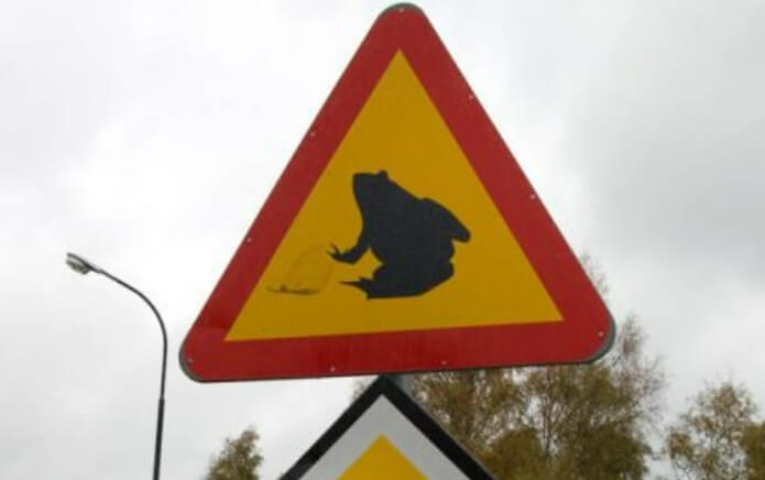 스웨덴에서는 빨간색으로 윤곽을 드러낸 노란색 삼각형과 검은색과 흰색으로 윤곽을 드러낸 다이아몬드가 우선 도로의 시작을 의미하는데, 이것은 이 도로에서는 양서류들이 통행권을 가지고 있다는 것을 의미한다. 사진 제공 존 리어달.