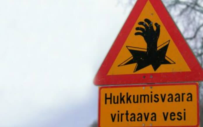 핀란드에 있는 이 표지판은 살얼음의 위험성을 경고한다고 우리는 생각한다. 그것은 핀란드 도로 관리국의 도로 표지판이나 다른 장치들의 공식 목록에 없었기 때문에 우리는 확인할 수 없었다. 두번째 추측은? 좀비들. 사진 제공: 블로그.RatesToGo.com.