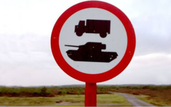 스코틀랜드 인버네스의 조지 요새 밖에서 맥 트럭과 탱크를 경고하는 것은 탱크를 가지고 뛰어오르는 맥 트럭에 대한 경고인 것 같다. 사진은 Flickr.com을 통해 스튜어트와 젠 로버트슨의 제공입니다.