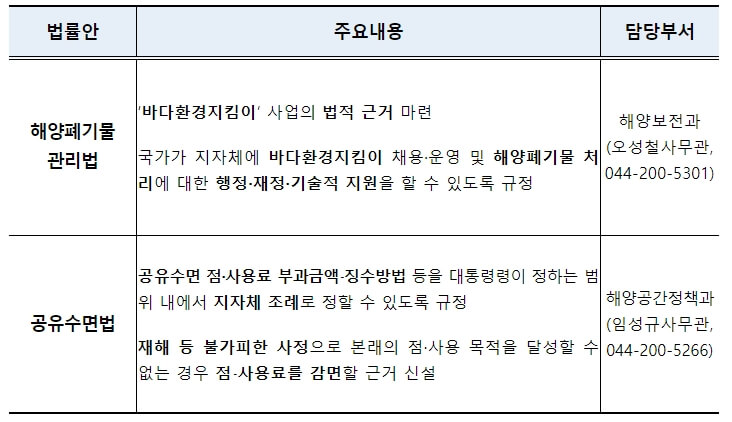 해양폐기물 관리법 개정안은 지역별 해안쓰레기 수거를 위한 ‘ 바다환경 지킴이 ’ 사업의 법적 근거를 마련하는 내용이다 . 해안쓰레기 의 경우 발생주체가 불명확하고 신속히 수거하지 못할 경우 다시 바다로 흘러 들어가는 등의 악순환이 발생하기 때문에 , 상시적인 수거 체 계 를 구축하는 것이 중요하다 . 이에 해양수산부는 각 지자체별로 수거인 력 을 배치해 담당 구역의 해안쓰레기를 수거하도록 하는 ‘ 바다환경지 킴이 ’ 제도를 2019 년부터 도입해서 운영 * 중이다 .