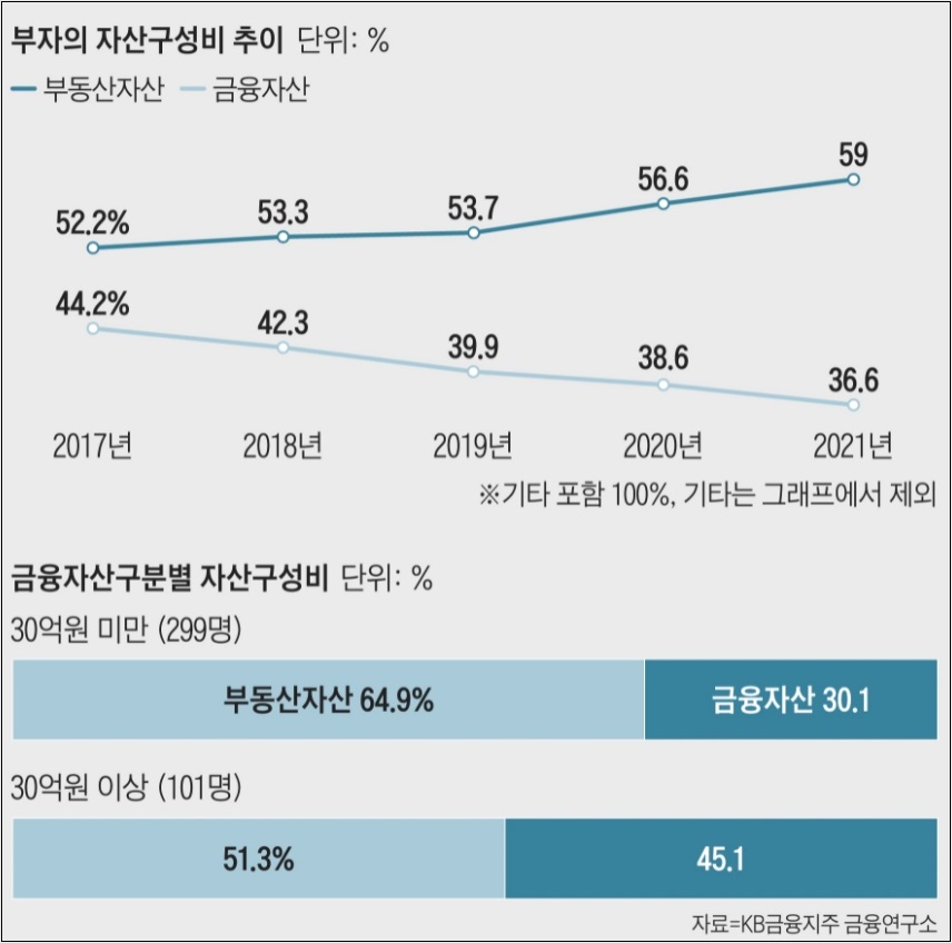 부자들이 선호하는 자산 배분 전략은 ‘부동산’이다. 부자의 자산 포트폴리오는 부동산자산이 59.0%이고 금융자산은 36.6%다. 다만 금융자산 규모가 작을수록 부동산 비중이 더 높았다. 금융자산 30억원 미만 부자의 부동산 자산 비중은 64.9%, 30억원 이상 부자는 51.3%였다.