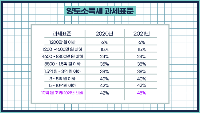 즉, 양도소득세는 차익에 대해 매기는 겁니다. 12억원짜리 집을 15억원에 팔았다면 ,3억원에 대해 내는 겁니다. 세율은 액수에 따라 6~45%입니다.