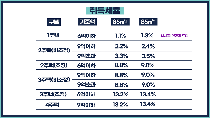 2주택자부터는 취득세가 가파르게 오르는데요. 조정지역과 비조정지역이 다른데, 지금 대다수 지역이 조정지역에 편입되어 있으므로 조정지역을 기준으로 말씀드리겠습니다. 개인이 조정지역에서 2주택을 매수할 때는 85㎡ 이상은 9%(85㎡ 이하는 8.8%), 3주택 매수할 때는 13.4%(85㎡ 이하는 13.2%)가 적용됩니다. 참고로 조정지역에 해당하느냐 아니냐는 원래 기존에 가지고 있던 주택이 아니라 새로 취득하는 주택이 기준입니다.
