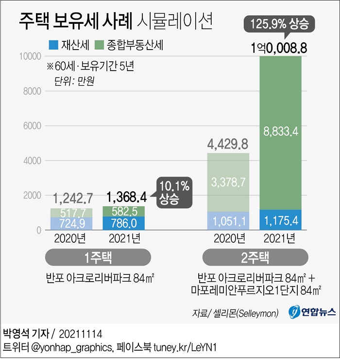 부동산 세금계산서비스 '셀리몬(Selleymon)'의 보유세 시뮬레이션을 보면 서울 반포 아크로리버파크 84㎡를 보유한 A씨(60세·보유기간 5년)의 보유세 부담액은 1천243만원에서 1천368만원으로 10.1% 오른다.