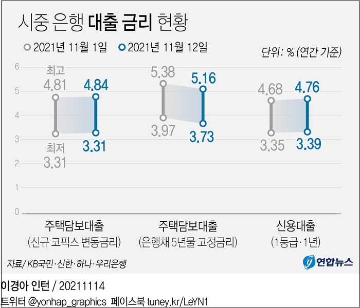14일 금융권에 따르면 KB국민·신한·하나·우리은행의 12일 기준 주택담보대출 변동금리(신규 코픽스 연동)는 연 3.31∼4.839% 수준이다. 지난 1일(3.31∼4.814%)과 비교해 열흘 새 상단만 0.025%포인트 높아졌다.