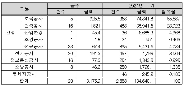 조달청은 금주(’21.11.15.~'21.11.19.)에 총 90건, 3,176억 원 상당의 공사입찰을 집행할 예정이다.