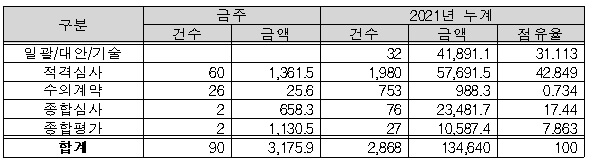 계약구분별로 종합평가 1,131억 원, 종합심사 658억 원, 적격심사 1,362억 원, 수의계약 26억 원으로 집행될 예정이다.