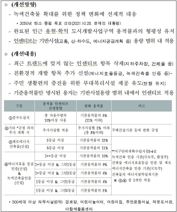에너지설치 3개 부문 녹색건물 설계기준 요소와 중수도 설치, 입주민들의 정주환경 향상을 위한 부대시설 설치 등으로 공동주택의 경우 민간사업자가 인센티브 적용 받아야만 기준용적률 220%에서 허용용적률을 250%까지 올릴 수 있도록 했다.