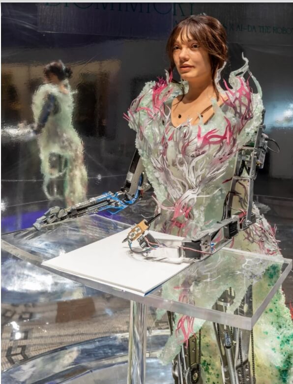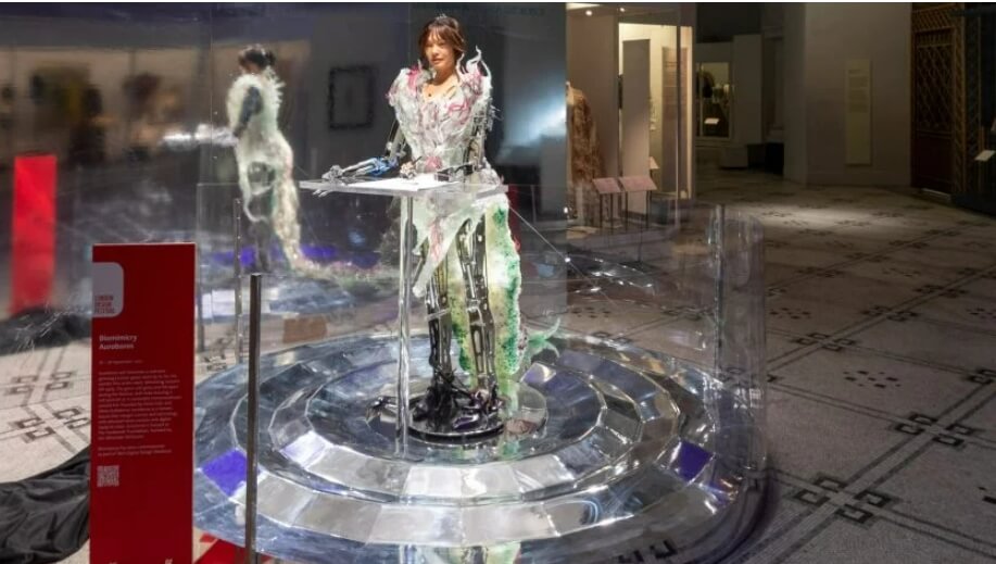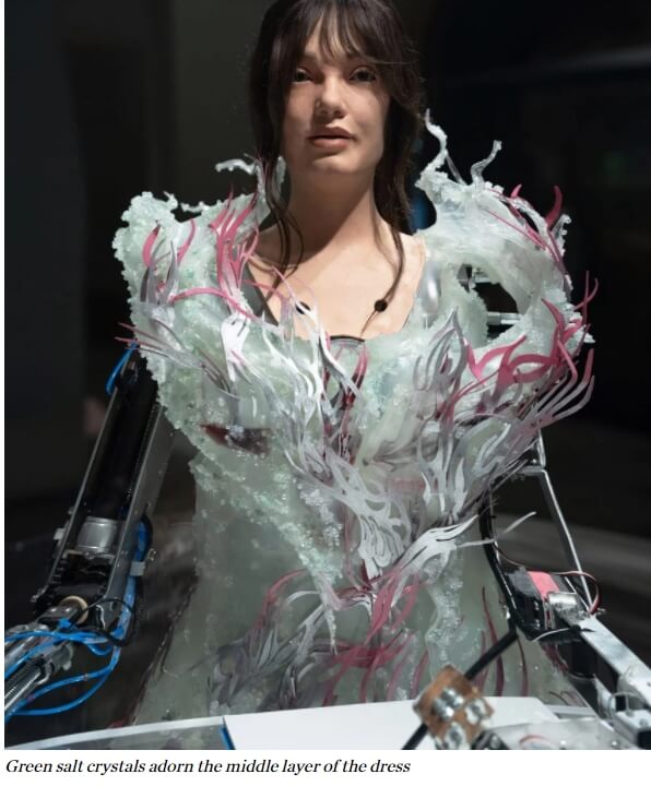 생체모방이라고 불리는 이 옷은 올해 초 런던 빅토리아와 앨버트 뮤섬에서 열린 전시회에서 인공지능 로봇인 아이다가 입었다.