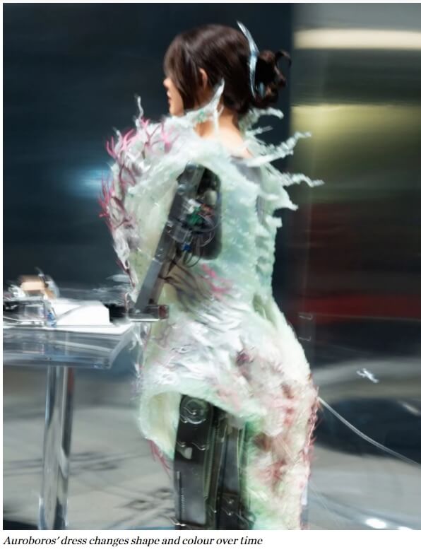 런던에 본사를 둔 패션 브랜드 오로보로스는 재활용된 플라스틱과 소금 결정으로 만든 드레스를 디자인했는데, 이 드레스는 꽃이 자라나는 것 같은 흉내내면서 색깔과 모양을 실시간으로 바꾼다.