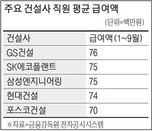 유가 상승과 해외 수주 등 영향을 받은 삼성엔지니어링도 지난해 3분기 누적 평균 6900만원에서 올해 3분기 7500만원으로 600만원 상승했다. 포스코건설은 지난해 3분기 누적 6500만원에서 올해 3분기까지 누적 7000만원으로 500만원 상승한 것으로 나타났다.