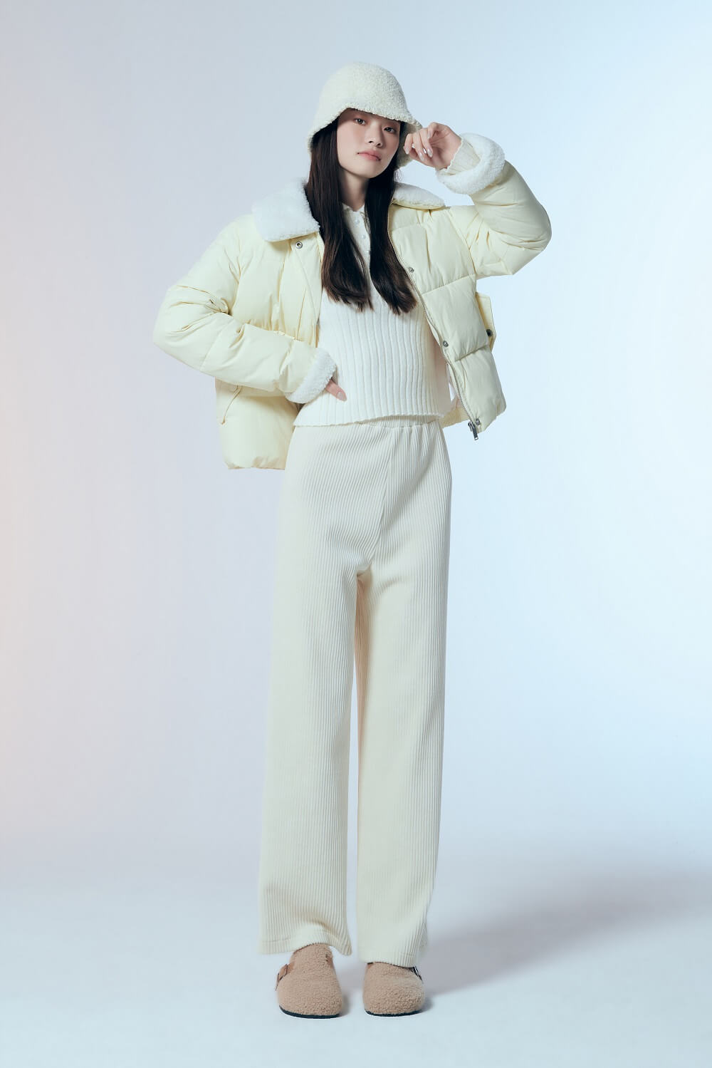 노란 빛의 아이보리 쇼트 패딩과 코듀로이 밴딩 팬츠를 매치한 원마일웨어 룩을 비롯해 라이트 그레이 쇼트 패딩과 연청 데님 팬츠를 매치한 캐주얼 룩, 베이지 쇼트 패딩과 플라워 패턴의 롱 원피스를 매치한 데이트 룩 등을 선보였다.