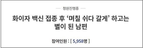 17일 청와대 홈페이지 국민청원에는 “화이자 백신 접종 후 ‘며칠 쉬다 갈게’ 하고는 별이 된 남편”이라는 제목의 청원이 올라왔다.