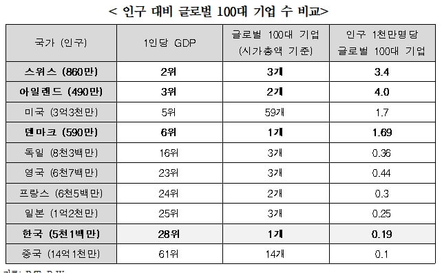 한편 보고서는 경쟁법은 경쟁과 소비자 후생 향상이 핵심목적이어야 한다고 지적하면서 경제력집중억제도 같이 추구하고 있는 우리나라의 공정거래법은 주요 선진국과 비교할 때 매우 예외적인 법체계라고 비판하였다. 보고서는 경제력 집중억제 정책의 이론적 근거가 되는 미국 1930년대의 ‘대기업집단 위험이론’*은 시대착오적이며 글로벌 차원의 경쟁이 일반적인 현 상황에서 우리나라 대기업에만 불리한 경제력집중억제 규제는 폐지되어야 한다고 주장하였다. 보고서는 우리나라 인구 대비 글로벌 100대 기업 수는 결코 많지 않다고 지적하면서 한국경제에 대한 대기업집단의 높은 기여도를 볼 때 대기업 수는 현재보다 훨씬 더 많아야 한다고 주장하였다.