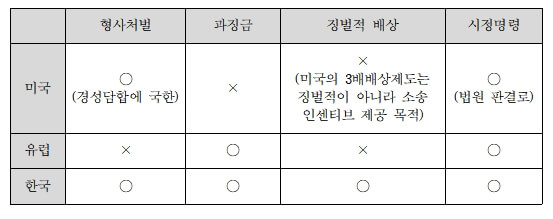 보고서는 또한 미국, 유럽, 한국의 경쟁법 위반 제재를 비교하면서 우리나라의 제재수준이 비교국에 비해 높아 모든 공정거래법 위반행위에 대해 과징금 제재와 함께 형벌조항을 두는 과잉처벌을 하고 있다고 지적하였다. 미국의 경우 경쟁법 위반에 대한 형사처벌은 경성담합에 국한하고 있으며 유럽은 시장경쟁을 행정질서로 파악하기 때문에 과징금만으로 제재하고 형벌 조항은 없다는 지적이다. 반면 우리나라는 과징금이라는 제재와 함께 형사처벌조항까지 두고 있어 과잉처벌이라는 것이 보고서의 비판이다.
