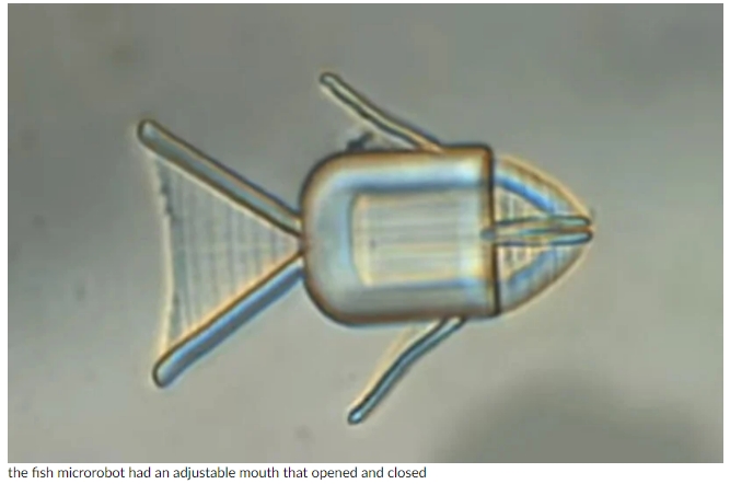 개념 증명 연구에서, 과학자들은 다른 작은 동물들: 물고기, 게, 그리고 나비처럼 생긴 세 개의 마이크로로봇을 실험했다. 마이크로로봇은 펨토초 레이저를 사용하여 pH 반응 하이드로겔로부터 4D 프린팅되었다.