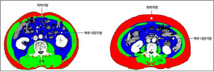 연구팀은 피하지방이 높은 환자군(남성 ≥141.73 ㎠, 여성 ≥168.71 ㎠)과 복부 내장지방이 높은 환자군(남성 ≥174.38 ㎠, 여성 ≥83.65 ㎠)을 '고지방 그룹'으로, 그렇지 않은 환자들을 '저지방 그룹'으로 구분했다.
