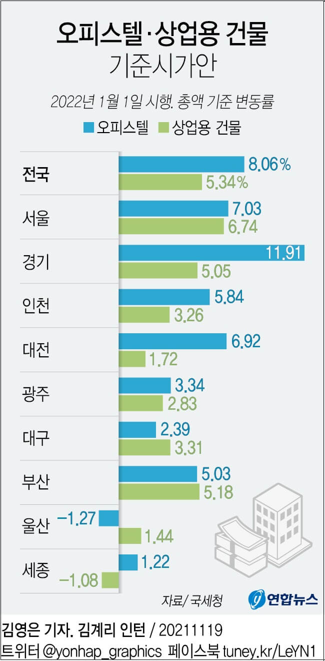 국세청은 19일 '2022년 오피스텔·상업용 건물 기준시가안'을 공개하고 이날부터 내달 9일까지 건물 소유자 등의 이의 신청을 받는다고 밝혔다.